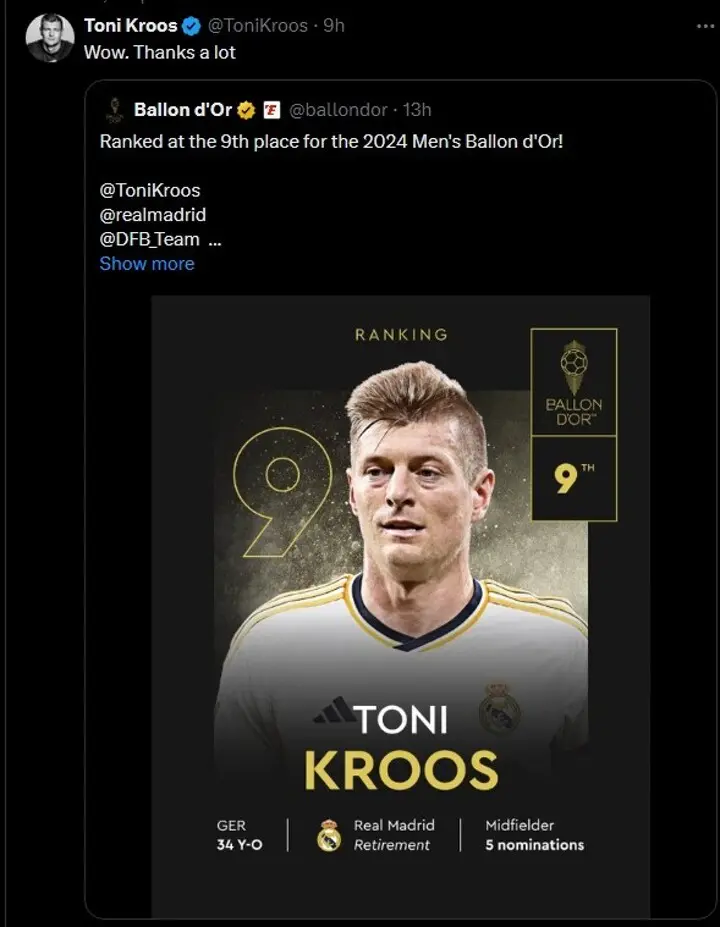 Toni Kroos humorously responded to his Ballon d'Or ranking